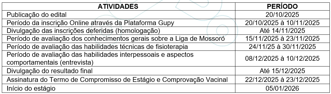 3.4. A Liga de Mossoró ofertará instalações, materiais e equipamentos que tenham condições de proporcionar ao acadêmico atividades de aprendizagem social, profissional e cultural, garantindo a qualidade da assistência fisioterapêutica;